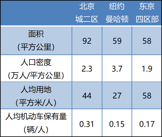 图14:北京、纽约、东京的面积、人口密度、人均用地和人均机动车保有量对比