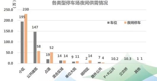 当我们的生活水平提高到一定程度,即提高到人人都能买得起一辆车的程度时,却没有足够的土地来让每个人都能拥有一辆车且有地方停,除非把全国的城市面积或城市建筑密度再提高一倍。◆共享停车泊位能否解决问题?现在有种观点是认为共享停车泊位能够解决城市“停车难”。理论上停车泊位是可以共享的,也有相应的资源,但是推进起来较难。根据北京现有的停车位使用情况(见图9)可以看到,公共建筑夜间停车泊位的闲置率非常高,平均利用率只有39%,大约有89.7万个停车泊位处于闲置状态,且均位于居住区周边,距离居住区500米内占比80%,1千米内占比96%。可与此同时,居住区夜间停车泊位却拥挤得一塌糊涂。之所以会出现这种矛盾,一是因为共享停车缺乏动力,个人很难利用公共建筑里的闲置停车泊位;二是停车信息化不充分,共享停车缺乏传播讯息的有效渠道。因此,共享停车始终处于“叫好不叫座”的尴尬境地。